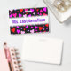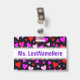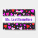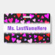 Cet amusement, aimant, caractéristiques de conception heureuses d'insigne un motif des formes de coeur de diverses tailles sur un arrière - plan noir. Les coeurs sont de diverses couleurs colorées, y compris des couleurs comme rouge, magenta, rose et le pourpre. Il comporte également un nom personnalisé en texte coloré par pourpre dans une bande colorée par blanc. Un insigne comme ceci a pu peut-être être porté par un professeur, un éducateur, un tuteur ou un professeur pendant les semaines tôt d'une année scolaire ou d'un cours. Il pourrait aider les étudiants à apprendre et se rappeler le nom de leur professeur. [~Z0000175]