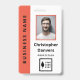 Badge d'employé de bureau vertical avec un design épuré minimaliste en orange, noir et blanc. Ajoutez une photo de l'employé avec le nom et la profession. Personnalisez davantage avec votre logo d'entreprise et le nom de l'entreprise.