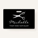 Salon de coiffure et salon de coiffure sur mesure Nom de l'employé Badge. Typographie de script classique et couleur arrière - plan personnalisée. Design élégant pour coiffeur, coiffeur, barbier, employé, collègue, personnel, personnel, etc. Logo de silhouette pour ciseaux de barbier professionnel. Ajoutez votre propre slogan d'affaires ou votre nom d'entreprise. Couleurs noir et blanc ou personnalisées.