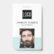 badge d'identité personnalisé d'entreprise avec un arrière - plan turquoise et blanc pastel, une photo de l'employé, le logo de votre entreprise, le nom, le code-barres et la profession.