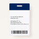 Créez votre propre plastique PVC personnalisé, durable, ne s'estompera pas ou déchirera, cool moderne tendance bleu marine et blanc, nom badge photo d'identité, avec choix de pièces jointes - lanière, clip métallique, rétractable, ou aucun. Pour personnaliser, entrez le nom de l'employé / du personnel / de l'exécutif, sa désignation, ainsi que toute information supplémentaire comme la pièce d'identité de l'employé, l'émission et la date d'expiration de l'insigne, en cas de perte retour à & l'adresse, etc. Ajoutez ensuite la photo de l'employé / du personnel / de l'exécutif, ajoutez le logo de l'entreprise / de l'entreprise, et ajoutez le code barre. Pendant que vous tapez/concevez, vous pourrez voir un aperçu de votre badge, tout au long du processus. Idéal pour les petites entreprises, les entreprises, l'école, le restaurant, le bureau, le concert, la vente au détail, l'hôpital, la clinique, et pour les employés, le personnel, le médecin, l'enseignant, l'étudiant.