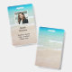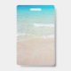 Modèle de badge personnalisé sur l'eau de mer et la scène de la plage avec place pour la pièce d'identité photo. L'eau tropicale de l'océan et le sable de plage sont l'arrière - plan de deux zones de texte personnalisé. Photo encadrée en blanc et texte imprimé en noir. Reverse a la même scène de plage. Choisissez de commander un bandeau, un clip ou un badge simple.