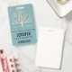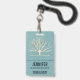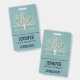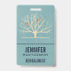 Étiquette nominative avec un fond vert assourdi superposé à un arbre jaune clair avec 2 silhouettes d'oiseaux orange perchés sur les branches.