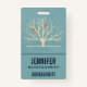 L'étiquette de nom avec un arrière - plan vert muet superposé est un arbre jaune clair avec 2 silhouettes d'oiseau orange sur les branches.