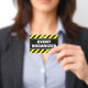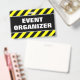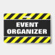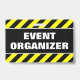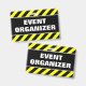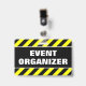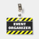 Ce dessin de badge comporte un motif rayé noir et jaune, ainsi que le message "ORGANISATEUR DE L'ÉVÉNEMENT" en caractères gras. Il pourrait peut-être servir à identifier les personnes qui ont organisé un événement.