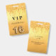Un badge moderne, élégant et glamour pour une fête des 16 ans, anniversaire Sweet 16. Un arrière-plan métallisé doré avec un effet de paillettes qui coulent, peinture qui goutte. Le nom est écrit avec une police manuscrite moderne. Avec le texte : VIP Le numéro 16 est écrit avec une police de caractères de style ballon, script.