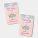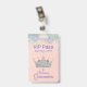 Le badge d'accessoires de la fête Chic Quinceañera fait dans une pêche légère, avec une couronne argentée et des graphiques de parties scintillant colorée, le long du sommet. Le texte couleur lavande est prêt à être personnalisé pour le grand jour de votre fille.