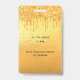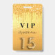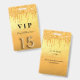 Un badge moderne, élégant et glamour pour une Quinceañera, 15ème anniversaire. Un arrière - plan à l'apparence or fauc avec fausse parties scintillant goutte à goutte, la peinture goutte à goutte. Le nom est écrit avec un script de style moderne écrit à la main. Avec le texte : VIP Numéro 15 est écrit avec une police de style ballon, script. Retour : date de la fête et adresse du lieu.