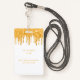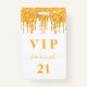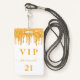 Un badge moderne, élégant et glamour pour une fête d'anniversaire de 21e (ou tout âge). Un arrière - plan blanc à la parties scintillant d'or faux goutte, la peinture goutte à goutte. Le nom est écrit avec un script de style moderne écrit à la main avec des swashes. Avec le texte : VIP Numéro 21 est écrit en couleur dorée. Pour que les swashes ne suppriment que le nom de l'échantillon, laissez les espaces ou émoticônes devant et après le nom.
