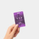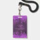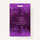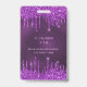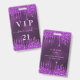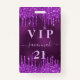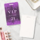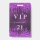 Un badge moderne, élégant et glamour pour une fête d'anniversaire de 21e (ou tout âge). Un arrière - plan violet profond à la fausse parties scintillant violette goutte-à-goutte, la peinture goutte à goutte. La couleur arrière - plan violette est inégale. Personnalisez et ajoutez un nom. Le nom est écrit avec un script de style moderne écrit à la main avec des swashes. Le texte : VIP Numéro 21 est écrit en rose. Pour que les swashes ne suppriment que le nom de l'échantillon, laissez les espaces ou émoticônes devant et après le nom. Retour : détails de votre fête.