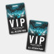 Ce badge VIP présente un design audacieux turquoise et noir, parfait pour un concert en plein air ou une fête avec une ambiance Coachella. Le long du haut, des silhouettes de palmiers s'étendent sur un ciel turquoise vibrant, créant une atmosphère de festival cool et énergique. L'image s'estompe en noir en bas, où le nom de l'événement, la date et « All Access Pass » sont affichés dans une police sans empattement blanche, propre et audacieuse. « VIP » est mis en avant en haut dans le même style simple pour un look élégant et moderne.