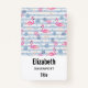 badge de nom personnalisé avec un motif avec une ambiance estivale amusante. Flamants roses et ananas posés sur un motif rayé bleu clair avec feuilles et coeurs tout autour.
