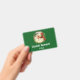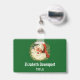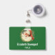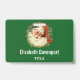 Badge nominatif personnalisé avec une image rétro représentant un Père Noël souriant et heureux entouré d'une couronne de pin avec une brindille de houx dans son chapeau.