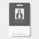 Badge nominatif d'agent immobilier moderne avec photo et logo. Conçu avec des couleurs gris foncé et or avec un espace pour votre photo, logo, nom, titre et nom de l'entreprise. Parfait pour un agent immobilier, courtier ou tout professionnel du marché immobilier. Utiliser lors de visites de maisons, d'événements de reconnaissance client et de tournées de maisons.