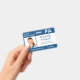 Gardez votre hôpital ou votre cabinet médical en sécurité avec des badges photo personnalisés horizontaux qui portent la photo de votre employé, son nom, son abréviation professionnelle, son titre, son numéro d'identification et son nom commercial. Vous pouvez également inclure un département. Parfait pour un médecin assistant, une infirmière ou un autre personnel. Au verso, vous pouvez ajouter plus d'informations, par exemple où retourner le badge s'il se perd. Customisez-le avec une photo et du texte personnalisé dans la barre latérale. La photo carré à gauche a une fine bordure blanche entourée de bandes bleues sur le dessus et le bas et de fines lignes bleues sur les côtés. Un bloc blanc situé sur le côté central droit met en surbrillance le titre du travail, le numéro d'identification et la date d'expiration en bleu foncé. Le nom du membre du personnel, l'acronyme de l'emploi et le texte de l'hôpital ou de l'entreprise sont blancs sur le bleu. Vous pouvez modifier les couleurs de l'arrière - plan et du texte pour qu'elles correspondent à votre marque en appuyant sur "cliquer pour customiser plus loin". Vous pouvez également ajouter un clip métallique, une longe ou une pièce jointe rétractable dans la barre latérale. Voir d'autres badges d'identité dans la collection Rocklawn Arts. Copyright ©Claire E. Skinner. Tous droits réservés.