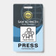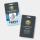 Les vagues colorées d'ombres bleues stylisées sont accentuées par une empreinte globale sous-jacente sur la couche supérieure du badge. Voici un logo en option de la silhouette de ville globale en faux or que vous pouvez utiliser. Ensuite, vous trouverez votre nom prestigieux, votre titre de travail et un modèle photo pour télécharger des photos jusqu'à une taille de 1 000 x 1 000 pix. Près de la base de l'insigne est un commentaire légende "PRESS". Vous pouvez changer la légende pour qu'elle corresponde à vos besoins. Juste en-dessous se trouve le nom de l'organisation.