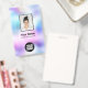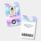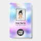 Personnalisez facilement ce Pastel Holographique personnalisé Insigne de nom d'employé avec photo, code de la barre de numérisation et logo commercial. Un design d'affaires coloré et mignon dans des couleurs pastel pour bébés entièrement personnalisable en tailles avant et arrière, sans-serif fontes de base et moderne et un look professionnel et clair. Disponible avec un cordon, un clip métallique ou avec rétractable.Pas de commande minimum.