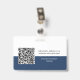 Personnalisez facilement ce badge de nom d'employé minimaliste horizontal personnalisé avec photo, scannez le code QR ou le code-barres et le logo de l'entreprise. Un design d'entreprise simple avec photo ronde, en couleurs bleu marine et blanc entièrement personnalisable en tailles avant et arrière, polices basiques et modernes sans serif et un aspect professionnel et clair. Disponible avec un cordon, un clip métallique ou rétractable. Aucune commande minimum.