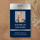 badge photo moderne en marine et en argent avec espace pour une photo de profil personnalisée, le titre de l'emploi, les coordonnées, les services et le code barre. Cet élégant badge de nom d'employé présente des effets arrière - plan bleu foncé et faux chrome avec texte entièrement modifiable et une photo.