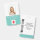Photo ID Employé Hôpital Médicale professionnel aqua ou bleu turquoise et blanc Badge. Un simple badge d'identité photo de nom médical moderne conçu professionnellement comme un modèle en ligne pour un établissement de soins de santé ou un hôpital avec la possibilité de remplacer la photo du personnel, le logo du modèle, le nom de l'employé et le titre professionnel. À l'arrière, ajoutez des informations supplémentaires telles que l'adresse de retour, le code à barres et le numéro d'identification de l'employé. Idéal pour les logos d'entreprise ronds.