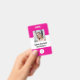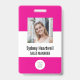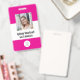 Ce badge présente un arrière - plan rose chaud tendance divisé par un bloc de couleur blanche. Customisez-le avec votre photo carré, nom, titre de travail, logo, nom de l'entreprise, adresse ou autres informations, et code à barres en option.