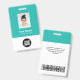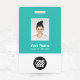 Personnalisez facilement ce badge de nom d'employé bleu clair Turquoise personnalisé avec photo, code de barre de numérisation et logo d'entreprise. Un design d'entreprise simple dans des couleurs turquoises, turquoise et blanche, entièrement personnalisable en tailles avant et arrière, sans-serif polices basiques et modernes et un look professionnel et clair. Disponible avec cordon, clip métallique ou avec rétractable. Pas de commande minimum.