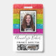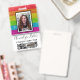 De fausses paillettes arc-en-ciel brillent agréablement derrière un modèle de photo avec un cadre noir et blanc. Mettez facilement à jour le nom et le titre professionnel pour chaque badge employé personnalisé. Il y a également un espace pour un logo d'entreprise - supprimez-le pour laisser vide. Le verso présente plus de fausses paillettes et un modèle d'image parfait pour les codes-barres des employés. Disponible dans de nombreux autres styles et couleurs.