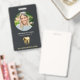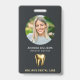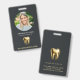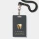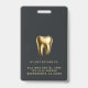Badge d'identification photo moderne, professionnel et élégant pour le cabinet dentaire. Ce design présente une seule photo, le nom, le titre et le nom de l'entreprise sur le devant, complété par un logo de dent en or sur fond sombre. Personnalisez davantage le dos avec votre adresse. Ce badge d'identification est parfait pour les employés du cabinet dentaire, offrant une apparence sophistiquée et cohérente pour votre équipe.