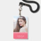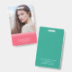 Un badge photo moderne et chic avec un design superposé rose sur le devant où vous pouvez également ajouter votre photo et un dos de couleur sarcelle. Parfait en tant que badge de bureau pour votre personnel et également un excellent moyen de vous présenter lors de réunions ou d'événements.