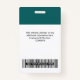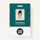 Personnalisez facilement ce badge personnalisé de nom d'employé avec photo, code de barre d'analyse et logo d'entreprise. Un design d'entreprise simple dans des couleurs turquoises vert foncé et blanc entièrement personnalisable en tailles avant et arrière, sans-serif polices de base et moderne et un look professionnel et clair. Disponible avec cordon, clip métallique ou avec rétractable. Pas de commande minimum.