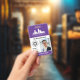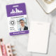 ID d'employé vertical avec une couleur d'accent violet. Ajoutez une photo, 2 logos, nom, titre, numéro d'identification et plus pour un badge professionnel d'identification d'employé. Un badge d'employé pratique et professionnel personnalisé avec photo, un logo plus grand et un logo plus petit, ainsi que le titre, le nom commercial et le nom.