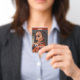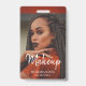 Un badge d'employé d'entreprise de maquillage de style tendance moderne avec une typographie de script moderne blanc et une photo glamour. Téléchargez votre propre photo glamour.