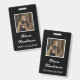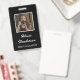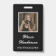 Assurez-vous que les gens savent qui vous êtes à votre stand, en marchant autour des événements et des salons avec cette étiquette photo en noir et blanc qui comprend le script blanc et la typographie moderne et photo personnelle avec une bordure blanche sur un arrière - plan noir des deux côtés.