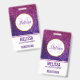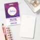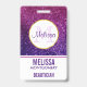 Insigne de nom avec un design élégant et soigné. L'arrière - plan composé de pierres de parties scintillant brillantes rose et violet. Une ambiance tendance et féminine. Un cercle avec une bordure fausse feuille or superposée avec votre nom et votre initiale à l'intérieur.