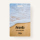 Nom tag avec une photo d'une plage de sable brun doré avec surf mousse blanc.