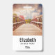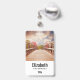 badge de nom personnalisé avec une photo pittoresque. Un pont en bois qui mène à un chemin entouré d'arbres forestiers qui changent de couleur.