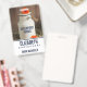 Badge nominatif avec un thème rustique. Une photographie d'un pot à lait blanc et de quelques fleurs orange disposées autour du pot à lait. Posé dans une grange sur du foin. Panneaux de bois en arrière-plan.