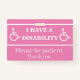Insigne rose. J'ai un handicap. Sois breveté, s'il te plaît. Avertissez les autres de handicaps invisibles. Donne ça à maman, soeur, grand-mère, amie, enfant, plus. Ils peuvent se porter en public pour faire savoir à tout le monde qu'ils peuvent avoir besoin d'un peu plus de temps que les autres. Personnalisez, effacez le dos et ajoutez vos propres mots. Peut ajouter un nom, un numéro de téléphone d'urgence ou une alerte pour maladie ou état de santé. Choisissez Modifier. Un cadeau réfléchi.