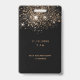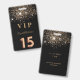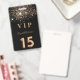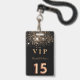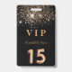 Un badge moderne, élégant et glamour pour Quinceañera, 15e anniversaire de naissance d'une fille. Un arrière - plan noir chic avec parties scintillant faux or. Le nom est écrit avec un script de style moderne en lettres de couleur or foncé. Avec le texte : VIP Numéro 15 est écrit avec une police de style ballon, script. Retour : date de la fête et adresse du lieu.