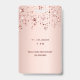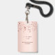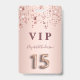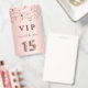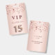 Un badge moderne, élégant et glamour pour Quinceañera, 15e anniversaire de naissance d'une fille. Un arrière - plan métallique à l'apparence rose à l'or rose et aux étoiles brillantes roses. Le nom est écrit avec un rose moderne de couleur or foncé à la main écriture style. Avec le texte : VIP Numéro 15 est écrit avec une police de style ballon, script. Retour : date de la fête et adresse du lieu.
