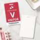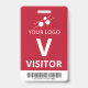 badge de visiteur vertical avec un design simple en blanc contre un arrière - plan rouge mat. Un grand V blanc permet de reconnaître rapidement le visiteur en tant que tel. Personnalisez avec votre logo d'entreprise et un code à barres.
