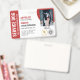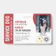 badge d'identification de chien de service horizontal en rouge et blanc avec espace pour une photo du chien de service et deux logos. Ajoutez le nom, le titre et le numéro d'enregistrement. Ajoutez également le nom du gestionnaire et les informations de contact.