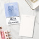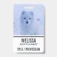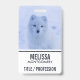 Badge nominatif avec une photographie d'un renard arctique blanc. Un paysage hivernal enneigé entoure cette créature charmante.