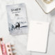 Étiquette de nom personnalisée avec une image aquarelle représentant un renne silhouette noire debout parmi quelques pins. Palette de couleurs neutres gris noir et blanc.