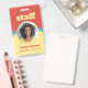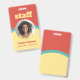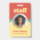 Un badge d'identification vertical à un côté pour votre personnel dans un design rétro en rouge tomate, jaune et turquoise. Personnalisez avec la photo, le nom et le titre de votre employé sous le personnel dans une police jaune accrocheuse. Le badge est simple et facile à lire, imprimé sans logo, en couleurs audacieuses et joyeuses.