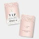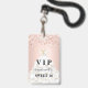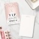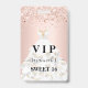 Un badge moderne, élégant et glamour pour une fête d'anniversaire Sweet 16. Un fond rose blush avec des confettis et une robe blanche. Avec le texte : VIP. Personnalisez et ajoutez le nom, l'âge, l'adresse/date. Le nom est écrit avec un style de lettrage manuscrit moderne avec des fioritures.
