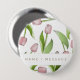 La conception du produit présente un motif de fleurs de tulipes roses. Cette illustration botanique avec texte personnalisé fait un bouton moderne et unique - Idée cadeau pour anniversaire, Pâques, fête des mères, enterrement de vie de jeune fille, faveurs de mariage, et plus encore !