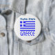 Touche de bouton personnalisée avec le drapeau grec et le mot, GRÈCE, en bleu ci-dessous. Le drapeau présente des rayures bleues et blanches avec une croix bleue et blanche en haut à droite. Au-dessus, ajoutez un nom pour une touche personnalisée à un cadeau de rembourrage. Amusant à porter lors de réunions de famille.