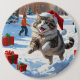 Badge Rond 15,2 Cm Chat de Sibérie courant dans la neige avec Casquet