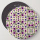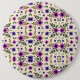 Round floral pattern button featuring a symmetrical design of purple and pink flowers with green leaves on a cream background, creating a vibrant and cheerful tone.